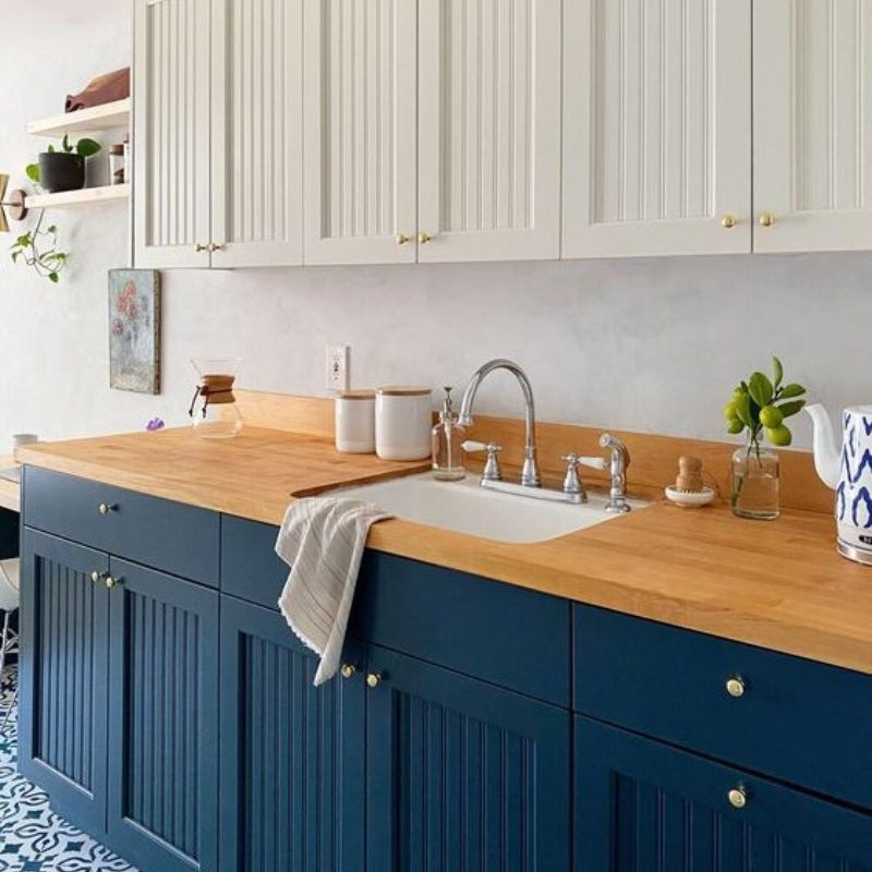 Beadboard kitchen cabinets feature vertical panel grooves that add texture and a classic charm to the kitchen. Often associated with farmhouse, cottage, or coastal-style interiors, beadboard cabinets bring warmth and character to the space. They are typically painted in soft shades such as white, cream, light blue, or pastel green. This design style creates a welcoming and homely atmosphere, making it perfect for traditional and country-style kitchens.