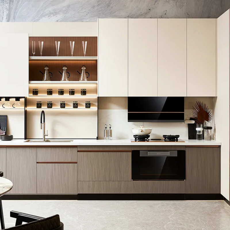 Glass and laminated material cabinets are among the most popular choices in modern kitchen interiors because they combine elegance with practicality. Glass-front cabinets create an open, airy feel and allow homeowners to display decorative crockery, glassware, or premium kitchen accessories. Frosted or tinted glass options provide privacy while maintaining a sleek aesthetic. Laminated cabinets, on the other hand, are highly durable, scratch-resistant, moisture-resistant, and easy to clean—making them perfect for busy households. Laminates come in matte, glossy, textured, woodgrain, and solid color finishes, giving homeowners endless design flexibility. This cabinet type is ideal for contemporary kitchens where style, durability, and low maintenance are equally important.