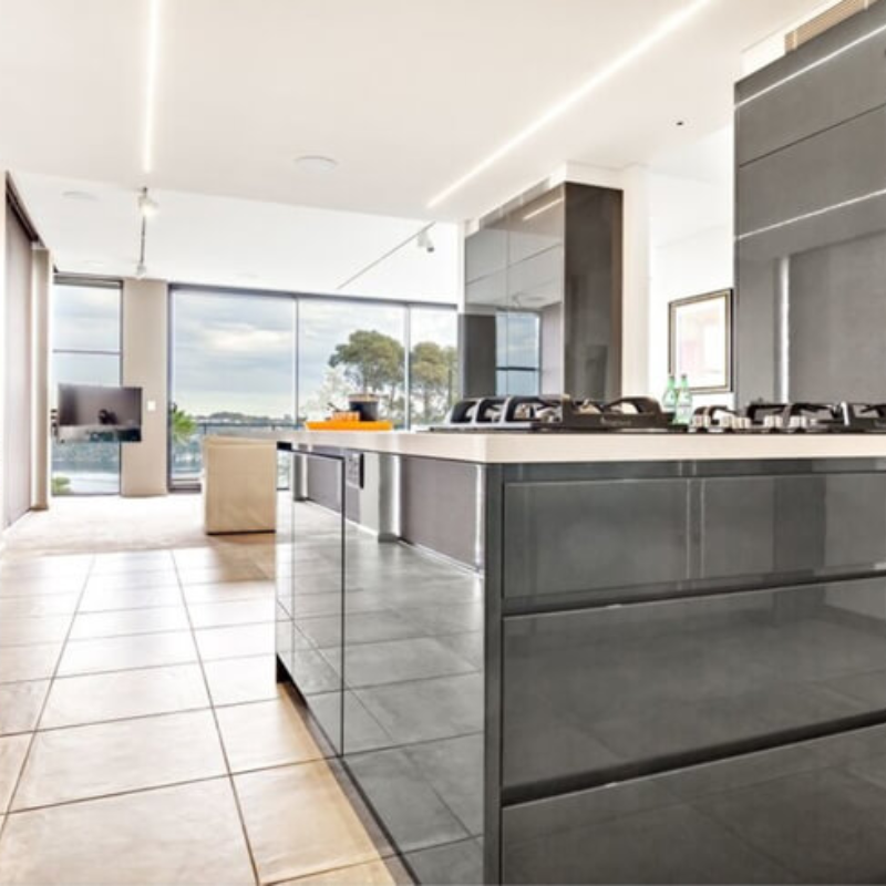 High-gloss lacquered cabinets are known for their luxurious shine and reflective surface that enhances light within the kitchen. The lacquer finish is applied in multiple layers and polished to achieve a smooth, mirror-like appearance. These cabinets make smaller kitchens appear larger due to their reflective properties. They are commonly available in bold colors like white, black, red, navy, and even metallic shades. While they offer a premium and contemporary look, they require regular cleaning to maintain their glossy appearance, as fingerprints and smudges can be visible. This style is perfect for modern, high-end kitchen designs where elegance and sophistication are key priorities.